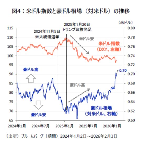 また、今回のRBAの利上げを受けて、豪州と米国の政策金利は逆転しました。米国では、5月の連邦準備制度理事会(FRB)議長の交代を経て、先行きの利下げ継続の見方が大勢を占めており、豪州と米国の金利差は2026年末に向けて拡大する可能性があります。