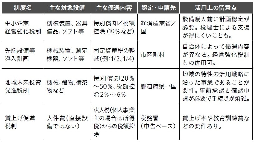 こうした状況で効果を発揮するのが、税制優遇措置との併用です。日本には、設備投資を行う企業に対して税負担を軽減するための各種制度が整備されており、補助金と税制優遇のダブル活用によって、経営に与えるインパクトをさらに高めることができます。