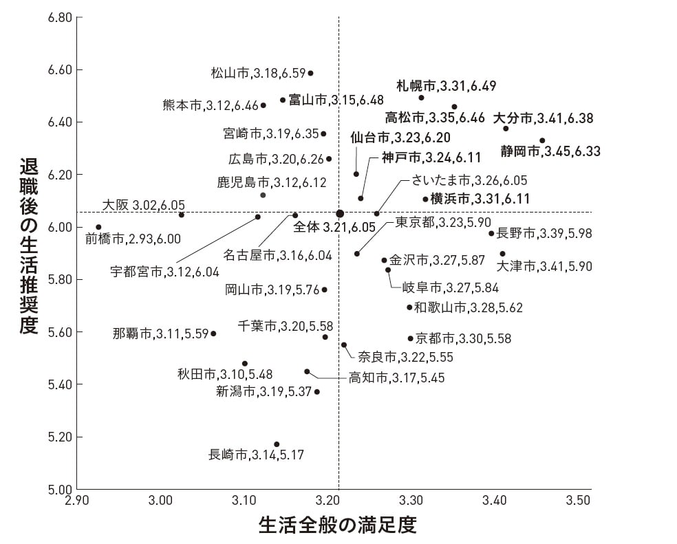 図表のように、横軸に生活全般の満足度、縦軸に推奨度をとって散布図を作ってみると、他人に推奨する度合いが高く、かつ住んでいる人の生活満足度が高い都市が右上の象限に表示されます。