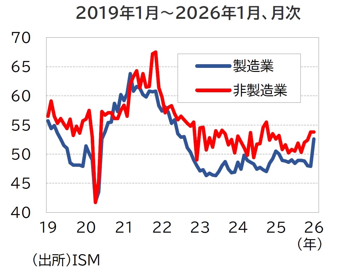 1月のISM景況指数は製造業が52.6、非製造業が53.8となり、いずれも市場予想を上回る結果となりました(図表2)。