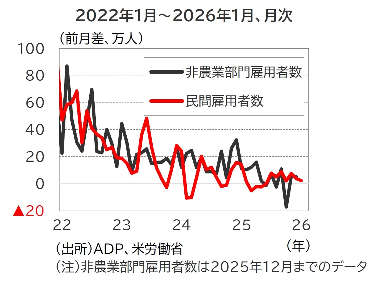 1月のADP民間雇用者数は前月差+2.2万人となり、市場予想(同+4.5万人)、前回2025年12月(同+3.7万人)をともに下回りました(図表3)。