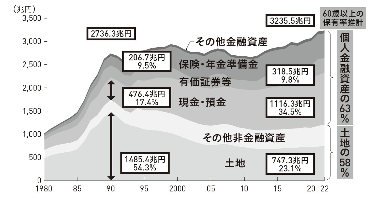 (注)1980~1993年は2000年基準のSNA、1994年以降は2011年基準のSNA。60歳以上の保有率推計値は、総務省「全国家計構造調査」(2019年調査)のデータより、年代別世帯保有平均値を世帯数で掛けて総額を計算し、それぞれの資産の保有比率を算出。