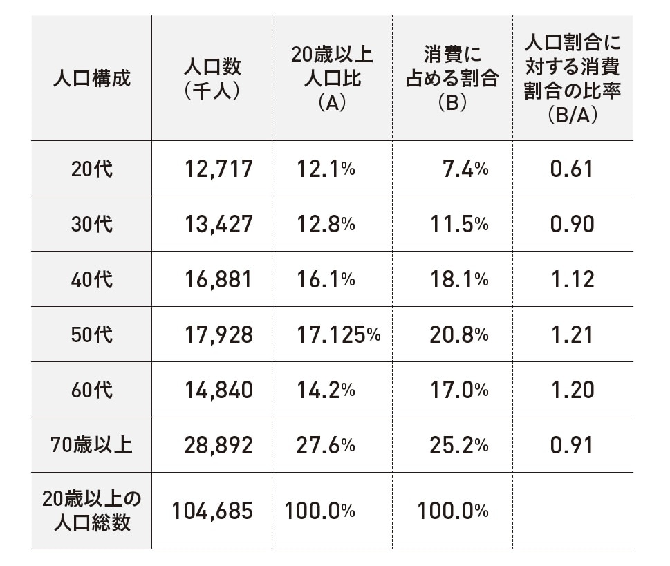 (注)人口数は2023年10月1日現在、消費に占める割合は内閣府「令和6年経済財政白書」より2023年データ。なお、20代の7.4%は、同白書のデータでは「20代以下」とされているが、ここでは便宜上20代の数値として使っている。四捨五入の関係で数値が整合しない部分がある。