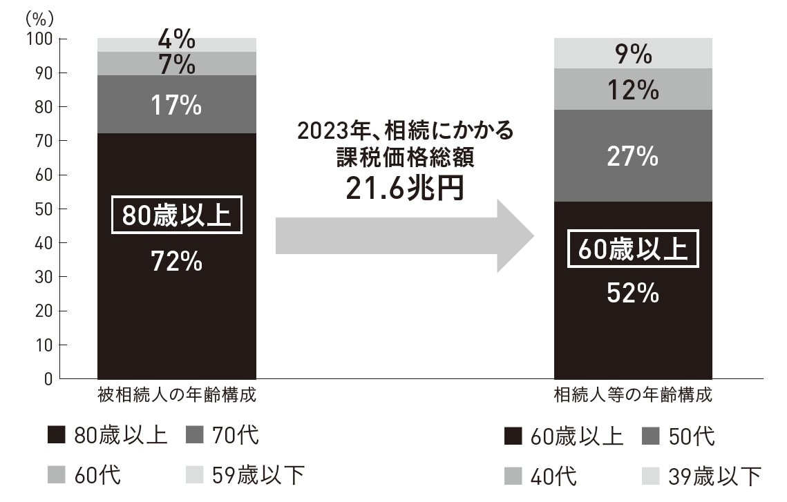 ただ、この数字は国税庁が相続課税の対象になった資産額を集計したもので、相続控除額以下の相続に関してはここに含まれません。すべてを含めると50兆円にも達するという推計もあります。日本の名目GDPが600兆円といわれるなかで、毎年その8%強の規模になる相続が行われているのです。