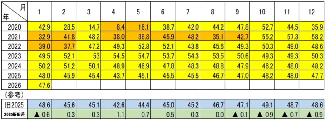 ※2020年1月~2025年12月の緊急事態宣言またはまん延防止等重点措置発令月(調査対象期間に発令が解除されていた月を除く)・平均35.2(旧35.1)、非発令月…平均47.7(旧47.8)