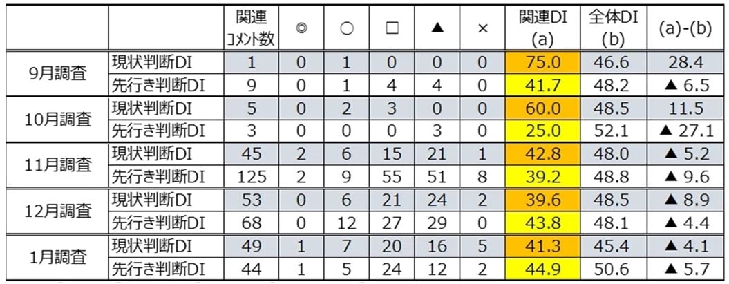 一方、1月の先行き判断DIは52.7で12月の47.8から4.9ポイント改善しました。2ヵ月連続の上昇です。インバウンド全体でみると、それほどひどいことにはならないという見方が多いのでしょう。コメント数は10月の42人から11月は120人に急増しましたが、12月は68人に低下し、1月は73人でした。