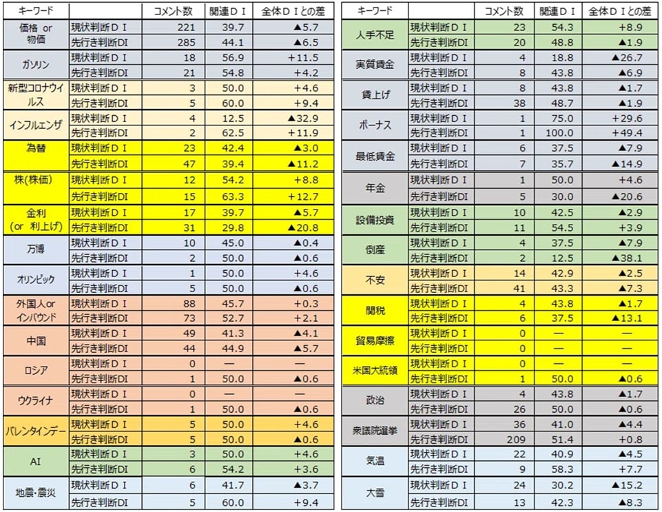 現在、ミラノ・コルティナ冬季オリンピックが開催されています。25年12月調査の先行き判断で「オリンピック」に関しコメントをしたのは3名、「オリンピック」関連先行き判断DIは41.7でした。1月調査の先行き判断で「オリンピック」に関しコメントをしたのは5名、「オリンピック」関連先行き判断DIは50.0でした。