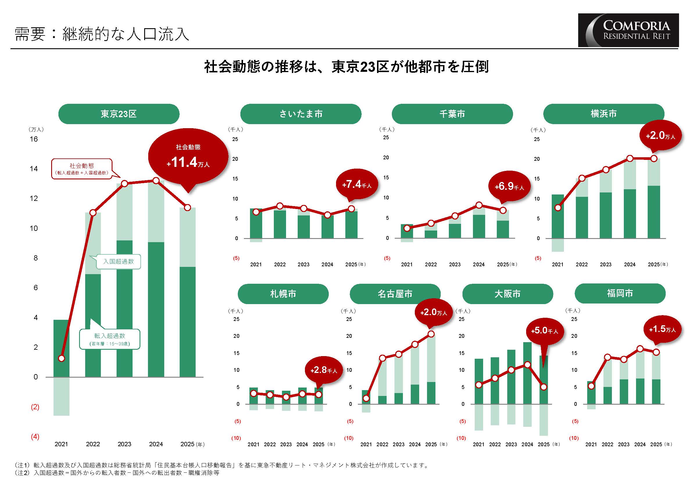 「東京23区の賃貸住宅市況は『圧倒的な超過需要』の状態にあります。これを裏付けるデータとして、賃貸住宅のメインユーザー層である若年層(15~39歳)と日本への入国者を合算した人口動態を見ると、東京23区は他主要都市を圧倒しています。2025年のデータ では、横浜市、さいたま市など首都圏に加え、名古屋市、大阪市、福岡市を見ても5千人~2万人に留まります。一方、東京23区は11万人を超えており、他都市に比べると潜在的な賃貸ニーズが圧倒的に異なります[図表1]」