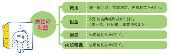 また、各種費用を差し引いたあとの税引前当期純利益については、そこから税金を捻出することになります。すなわち、最終利益までは、会社を運営するための費用と税金として使われるわけです。