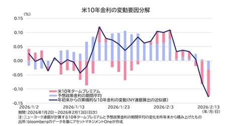 ①に関しては、筆者も含め、政治上の不透明感がタームプレミアムを拡大させると考えていた市場参加者は、一定数いたと思われます。しかし、実際には衆院選に大勝した高市政権が市場に配慮した積極財政を謳ったことで、日本では金利低下・円高となりました。また、英国のスターマー首相が任命した閣僚のスキャンダルを受けた政権の不安定化も、他の閣僚らが首相の支持を表明したことで、下火になりつつあります。政治イベントを消化し、長期金利の上昇を想定したポジションが解消された過程で、債券買いが強まった可能性はあるでしょう。