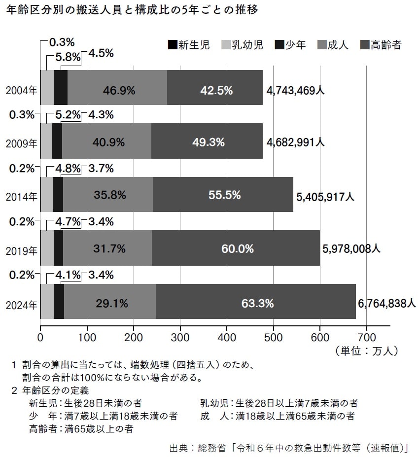 しかし、こうした要因以上に大きな影響を及ぼしているのが高齢化です。総務省の統計によれば、救急搬送された患者のうち65歳以上が占める割合は2004年の42.5%から2024年には63.3%へと上昇し、現在では搬送患者の約3人に2人が高齢者となっています。