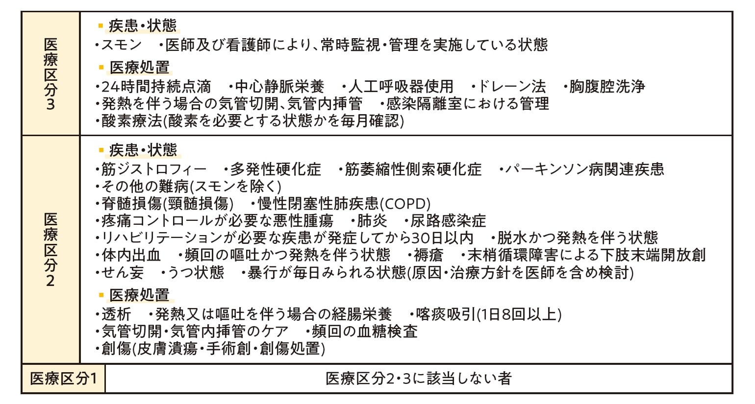 なんだかよくわかりませんが、なんとなく1日のほとんどをベッド上で過ごしていて、回復の見込みはなさそうで、看護師の配置が24時間確実に必要そうなイメージでよいかと思います。同じ寝たきりでも、特養の利用者とは介護ではなく医療への依存度が違います。24時間持続の点滴や気管切開に伴うチューブの管理、人工呼吸器管理、頻回な痰の吸引など、です。その管理や機器の使い方を誤ると、最悪の場合には患者が死に至るものと言うと伝わりやすいかもしれません。