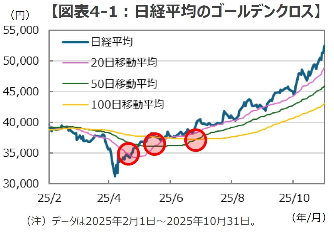 まず、(1)世界中の様々な投資市場の中から、値動き、出来高、流動性などから投資先を選びます。例えば、短期の移動平均が長期の移動平均を上に突き抜けるゴールデンクロスが生じていて(図表4-1)、最近のトレーディングレンジを上に突き抜ける動き(チャネルブレイク)がみられ(図表4-2)、出来高が増加中であり、ポジションをとるのに十分な市場規模・流動性がある投資対象を選びます。