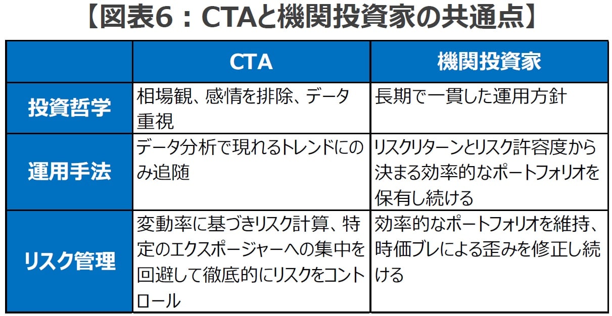 これまで機関投資家とは対極ともいえるCTAの代表的な取引手法(BO&TF戦略)について見てきましたが、意外にも両者には本質的な共通点があるようです。それは、両者の投資哲学ともいうべき部分で、(1)相場観や運用者の感情は投資判断から排除され、(2)あらかじめ決められたルールに従い粛々と投資判断がなされ、(3)徹底したリスク管理で守りを固めて相場に留まり続ける、ということです(図表6)。