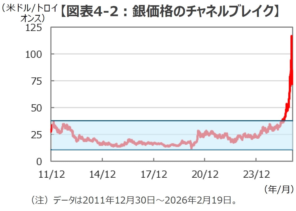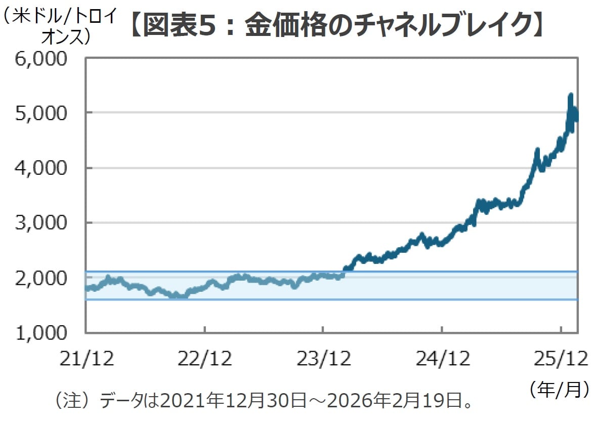 ここ数年の世界の金融市場や商品先物市場を振り返ると、金のスポット価格は間違いなく主役の一つとすることができそうです。金価格は2023年8月まで3年以上も1,600~2,100ドルのレンジでの推移が続き、何度も「騙し(抜けそうで抜けずに元のレンジに戻ること)」を繰り返していました。しかし、2024年3月に2,100ドルのレンジ上限を「ブレイクアウト」して力強い上昇トレンドが出現し、その後は押し目らしい押し目を作ることなく上昇を続け、2026年1月末には約2.7倍となる1トロイオンス当たり5,595.47ドルまで上昇しました(図表5)。