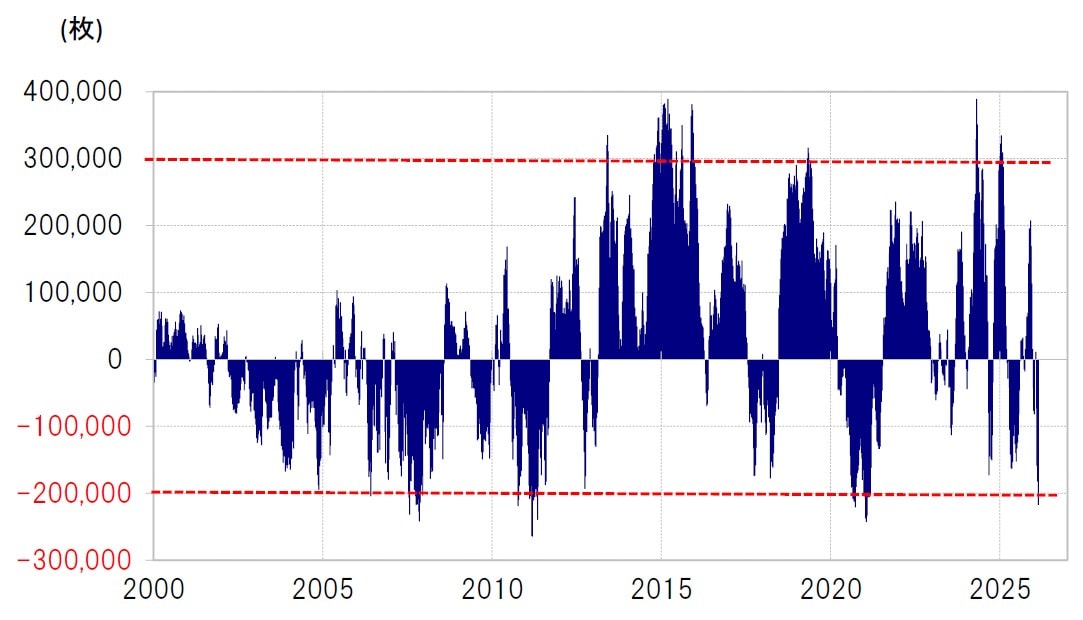 これまでも、トランプ政権の国際秩序を無視した行動を受けて、米国への信頼感低下により「米ドル離れ」が指摘されていました。たとえばCFTC(米商品先物取引委員会)統計の投機筋の米ドル・ポジション(主要5通貨=円、ユーロ、英ポンド、加ドル、豪ドルで試算)は、17日時点で売り越しが21万枚まで拡大しました(図表4参照)。