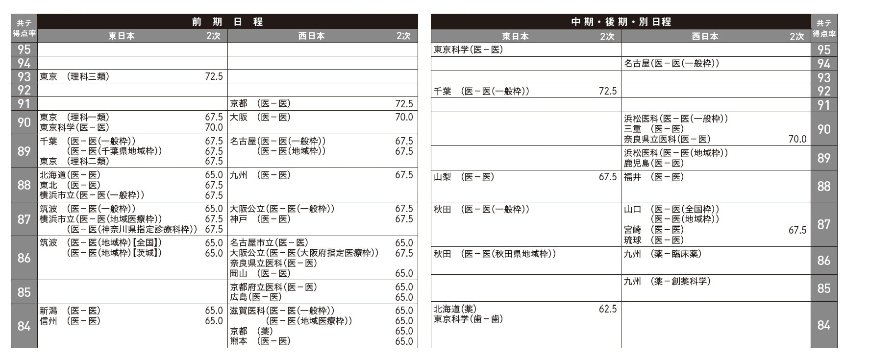 偏差値は、全国の進学希望者や高校の進路指導担当者が重視する基準の一つである。ただし、募集定員が少ないと推定誤差が大きくなり、偏差値の信頼性が低下する。定員5人のみで70台になるのと、50人で70台になるのとでは、意味合いが異なる。そこで、入試改革を念頭に掲げて以来、私は一貫して、募集定員が50人以上ある日程の入試、すなわち各大学が重点的に配分する日程に限って比較を行うようにしてきた。