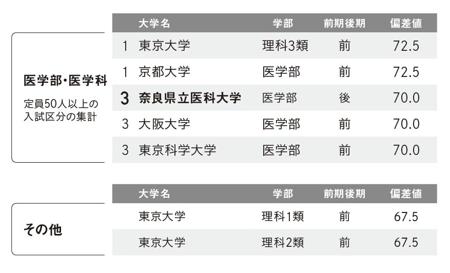 図表3のランキングは、この方法に基づいたものだ。河合塾のデータで、2026年度の募集人数50人以上の国公立医歯薬系入試の二次試験偏差値を見ると、奈良医大後期(募集定員53人)の二次試験偏差値は70.0で、72.5 の東大理3( 前期・同97人)、京大医学部(前期・同103人)に次いで第3位となっている。