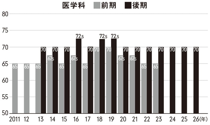 年度によって若干の変動はあるものの、2013年度の入試改革以来、奈良医大後期日程入試の偏差値は、常に70以上で全国トップクラスの仲間入りを果たしている。