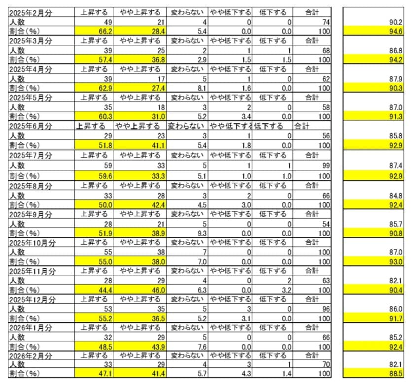 回答の内訳比率をみると、26年2月は「上昇する」が47.1%で、25年12月55.2%、26年1月48.5%と2ヵ月連続低下しました。2ヵ月連続40%台になったのは、24年9月42.6%、24年10月46.1%以来です。