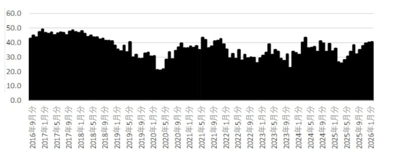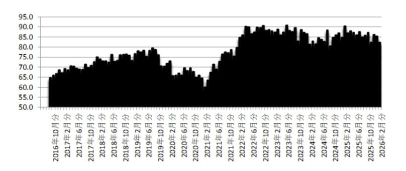 22年10月に90.4をつけたあと、80台後半の高水準での推移が続き、23年は6月に90.7をつけました。そこから振幅をともないつつ24年9月の80.3まで一旦低下しましたが、反転上昇傾向になり、25年2月に90.2と20ヵ月ぶりの90台を記録。25年3月以降は80台で推移しています。ただし25年12月86.0、26年1月85.2、26年2月82.1と2ヵ月連続低下しました。82.1は25年11月に並ぶ低めの水準で、2月の90.2から振幅を伴いつつ緩やかながら下降傾向にあります。