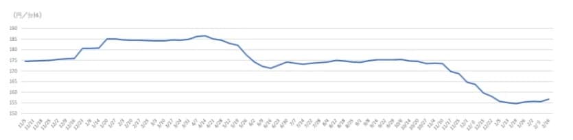 ガソリン全国平均156.7円、18回連続の前年比マイナスを記録