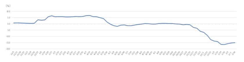 25年末に約50年にわたって続いてきたガソリン税の暫定税率が廃止されたことなどから、26年に入ってのレギュラーガソリンの全国平均価格は前年比で2ケタのマイナスが続いています。最新のデータの2月16日時点のレギュラーガソリンの全国平均価格は、156.7円/lで、25年2月17日の184.4円/lに比べ、前年比▲15.0%になっています。なお、前年比は25年10月14日の調査から18回連続でマイナスです。