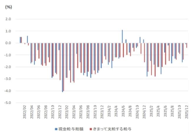 実質賃金は、現在、従来からの「消費者物価指数・持家の帰属家賃を除く総合」で実質化するものと、各国公表による主要国の実質賃金と比較するために「消費者物価指数・総合」で実質化するものと2種類あります。25年12月前年同月比では、前者はまだ▲0.1%とマイナスが続いているが、後者は+0.3%とプラスに転じました。