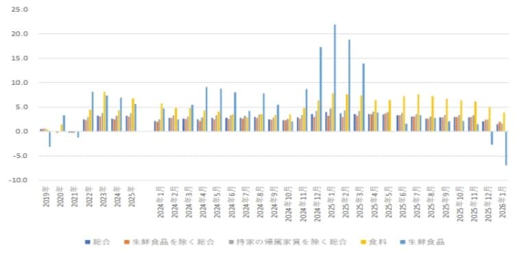 全国消費者物価指数では生鮮食品の前年同月比が、25年12月、26年1月と2か月連続前年同月比マイナスになっています。
