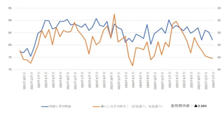 消費者マインドアンケート調査の暮らし向き判断DIと物価上昇判断DIの相関係数は、16年9月から21年8月までの最初の5年間は0.01と無相関でした。しかし、21年9月から26年2月までの最近の4年6ヵ月間では▲0.664のマイナスで、21年9月から26年1月までの▲0.656より逆相関の度合いが強まりました。26年2月では物価上昇判断DIは80台ながら82.1まで低下しています。22年1月79.5以来の70台まであと2.2ポイントです。