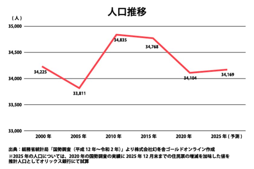 以下は、対象エリアの人口推移を示したグラフです。春日部駅エリアの人口は、2000年の34,225人から2020年には34,104人へと121人の減少(約-0.35%)にとどまっており、20年間を通じて大きな変動は見られません。2025年の推計人口は34,169人とされており、2000年比では56人減少(約-0.16%)と、今後も横ばいで推移する見込みです。