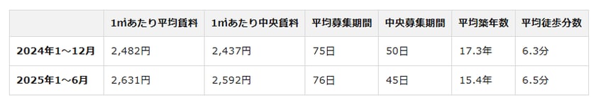 一方、募集期間については、平均募集期間が75日から76日へとほぼ横ばいで推移する一方、中央募集期間は50日から45日へと短縮しています。このことから、標準的な条件の物件では成約までの期間が短くなっている一方で、一部には募集が長期化する物件も残っているという状況がうかがえます。