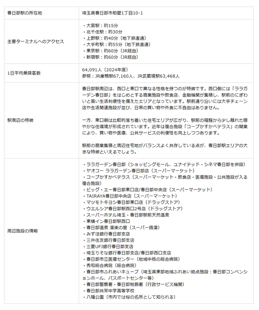これらの数値から、春日部駅エリアは都心通勤圏に位置するベッドタウンとして、ファミリー層を中心に安定した居住需要が形成されているエリアであり、家族向け住宅との親和性が高い地域特性を有していると考えられます。