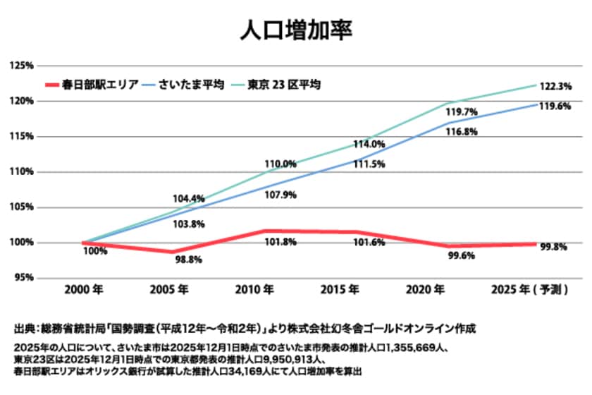 2000年を基準とした春日部駅エリアの人口増加率は、2020年時点で99.6%、2025年推計でも99.8%と、長期的に見ても変動はごく小幅にとどまっています。約25年にわたり人口規模は概ね横ばいと評価できます。