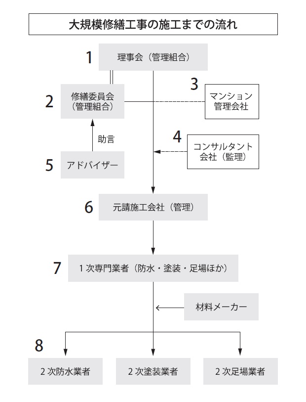 ここでの施工会社とは、大規模修繕工事を管理する会社のことである。発注後の施工について記したフローチャートを掲載した。