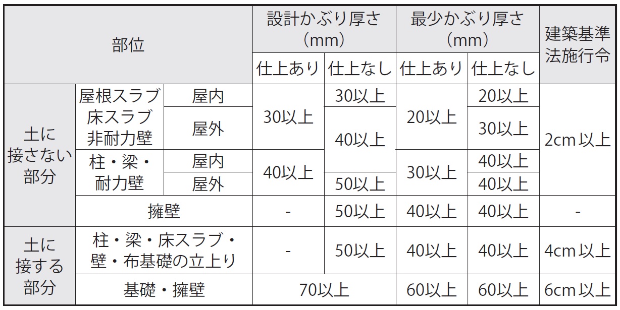 JASS5(日本建築学会刊行)では表のように決められており、このかぶり厚さを守ることが鉄筋コンクリートの品質を保つ大きな要因になる。最小は20㎜以上となっているが、場所によるものの30㎜以上は必要だ。