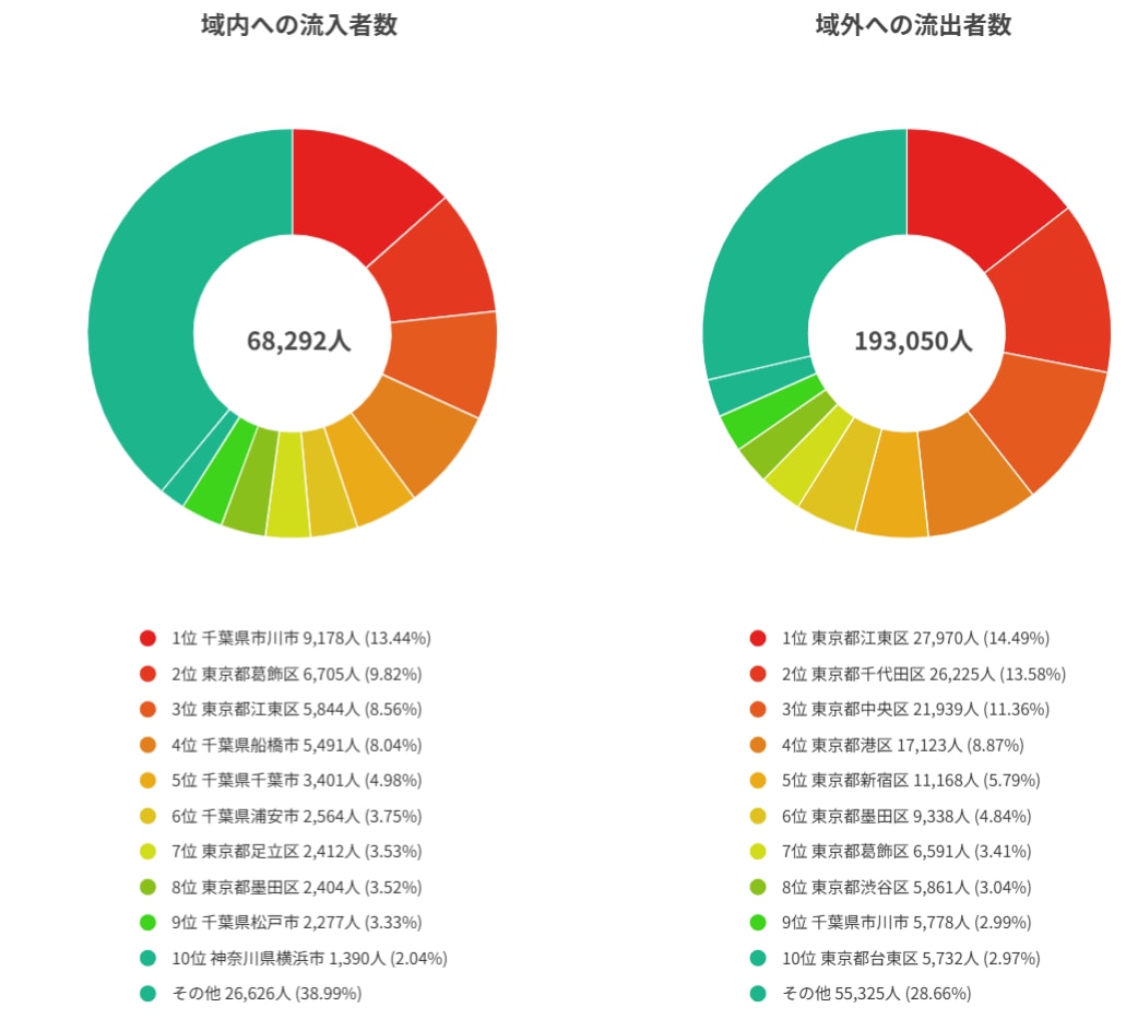 人の動き(昼夜人口比率)からも、この街の役割が浮き彫りになります。江戸川区の昼夜人口比率は81.92%と23区内で2番目に低く、区外への通勤・通学者が多い典型的なベッドタウンです。 流出先のデータを見ると、トップは「江東区」、次いで「千代田区」「中央区」「港区」と続き、これら4区で半数近くを占めています。