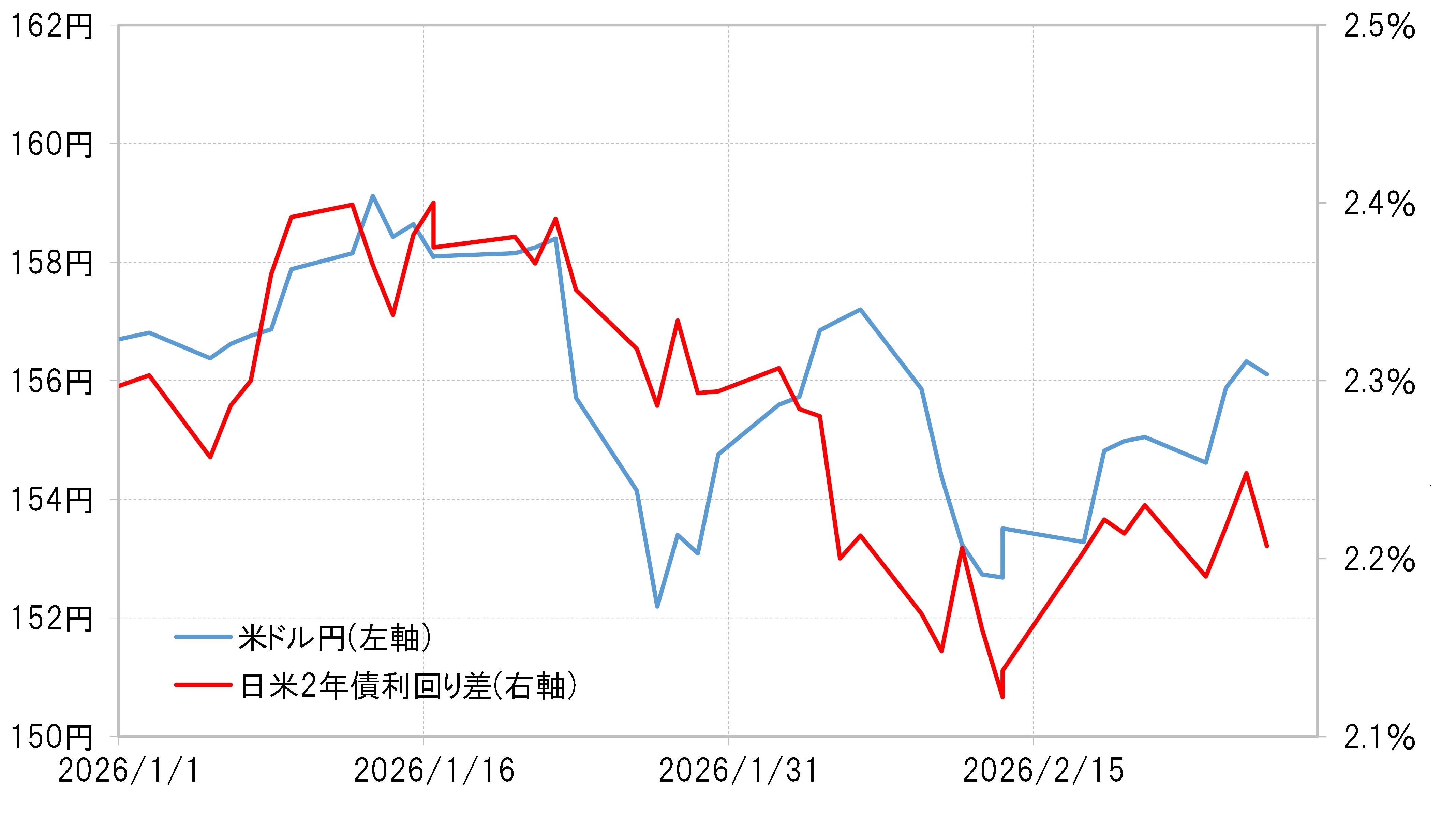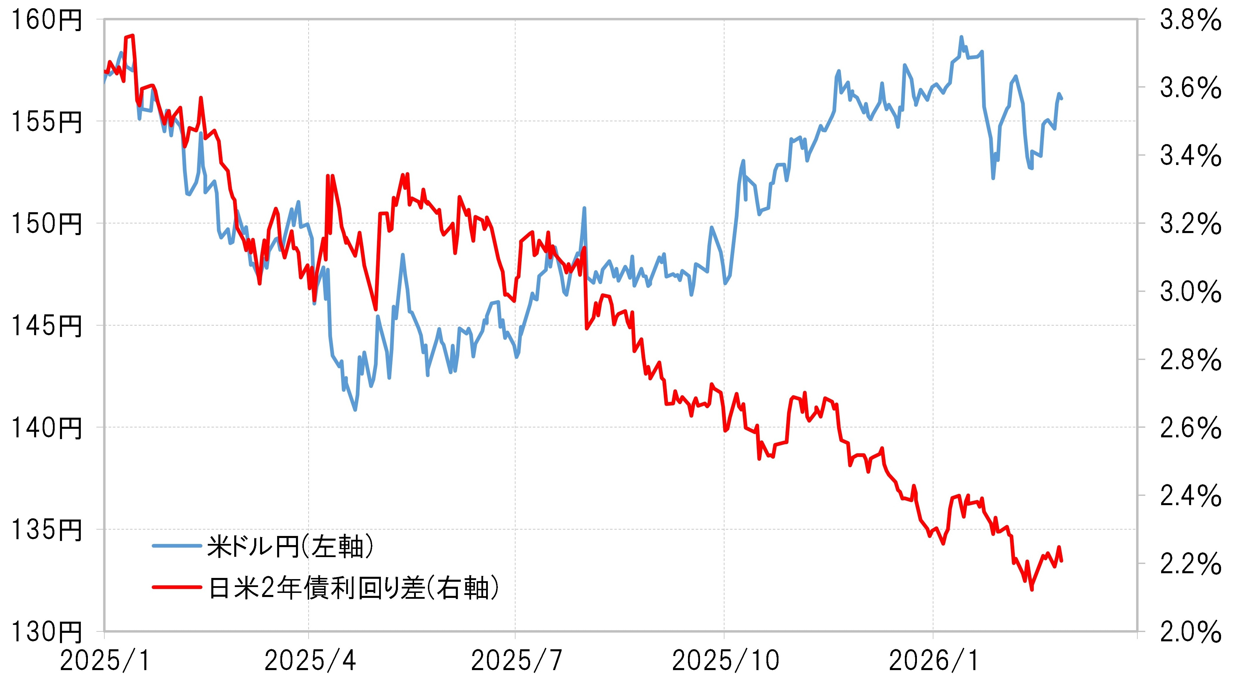 一方で、米ドル安・円高へ向かう要因としては、日米金利差縮小が鍵になるでしょう。日米の金融政策は、日本が利上げ、米国が利下げと逆方向を目指すなかで、金利差は基本的に縮小に向かう可能性が高いと考えられます。ただ2月には、上述のように高市総理による追加利上げへの難色といった報道、その一方で米国では次期FRB(米連邦準備制度理事会)議長人事や強い景気指標が利下げ見通しを後退させるところとなり、その結果金利差拡大となりました。