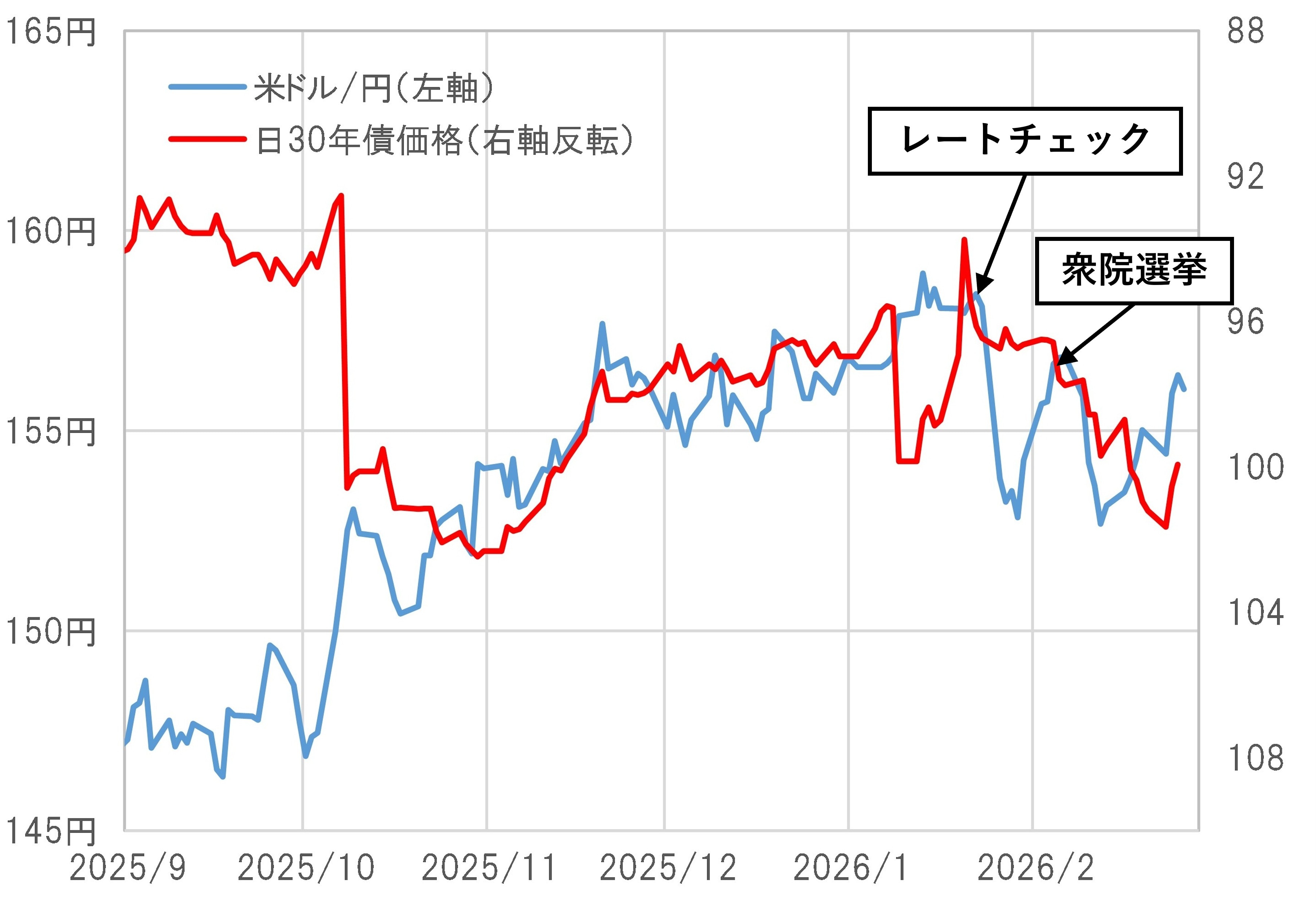 2月8日に日本の衆院選挙が行われ、自民党の歴史的圧勝となりました。自民党の勝利自体は基本的に選挙前から予想されていたものでしたが、そうなった場合高市政権の積極財政を懸念した債券安・円安が再燃するとの見方が多かったところが、結果的にはそれとは逆に債券高・円高となりました(図表1参照)。ではそれはなぜか。