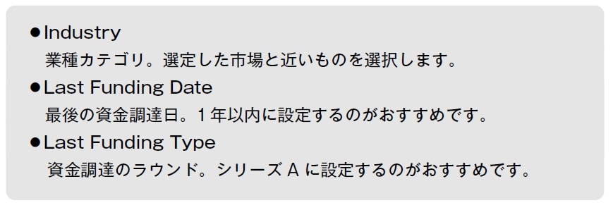 抽出されたリストの量が少なければ、対象とする業種を増やしたり、最後の資金調達日の期間を延ばしたりして調整します。