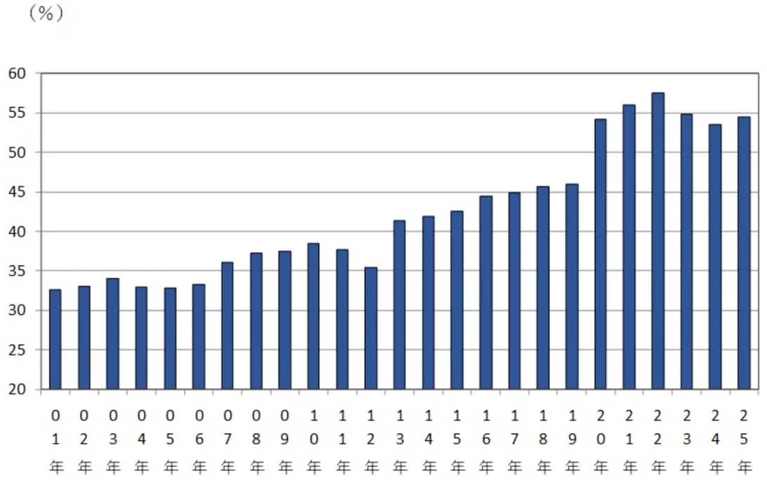 21世紀になってからの25年間の遺失届現金に対する拾得届現金の比率は、2012年までは30%台でした。しかし、アベノミクス景気という長期間の景気拡張局面があったこともあり、2012年35.4%をボトムに2013年から2022年の57.5%まで10年連続で改善しています。その後、2023年54.5%、2024年53.6%と2年連続で低下するという、限界的にみると気懸かりな動きもみられましたが、2025年は54.5%とやや戻しました。