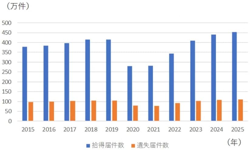 遺失届件数と拾得届件数はともに、新型コロナウイルス感染症の影響で2020年と2021年に大きく落ち込みました。そこから持ち直してきて2024年でどちらもコロナ前の水準を上回り、2025年では、さらに増加しています。