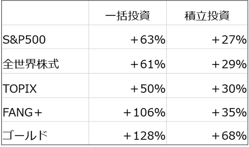 一括投資では最下位だったTOPIXがS&P500と全世界株式を抑えて第3位になっており、順位の逆転が起きています。また、FANG+とゴールドはどちらの場合も上位を維持していますが、差が縮まっています。