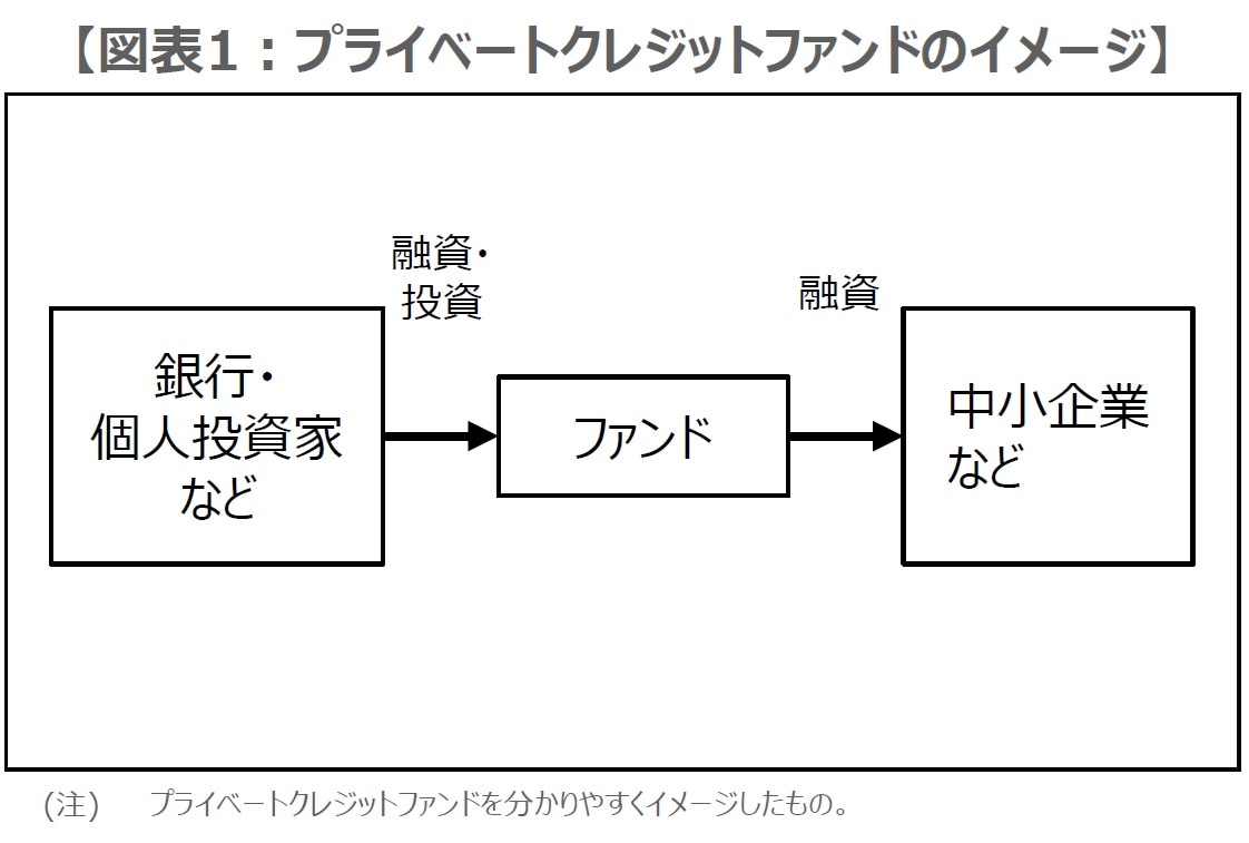 「プライベートクレジット」とは、銀行以外の貸し手によって提供される融資形態のことです。ファンドが貸し手となる「プライベートクレジットファンド」では、ファンドが中小企業に直接融資を行います(図表1)。融資に関する諸条件は個別交渉で決定され、金利は銀行の融資よりも高い金利となることがあります。ファンドに融資の原資を提供するのは銀行や投資家で、ファンドからは相対的に高い利回りが期待されます。