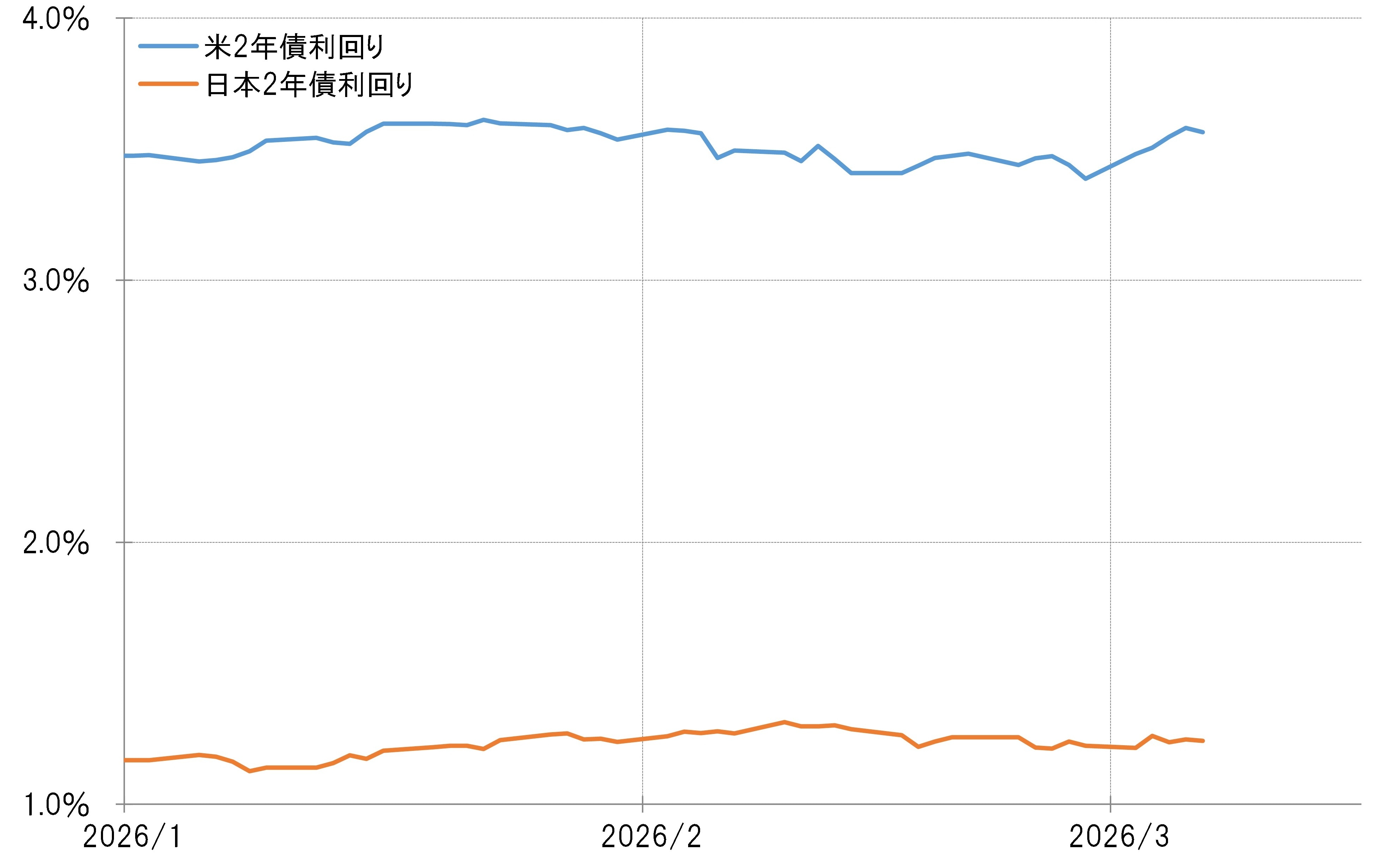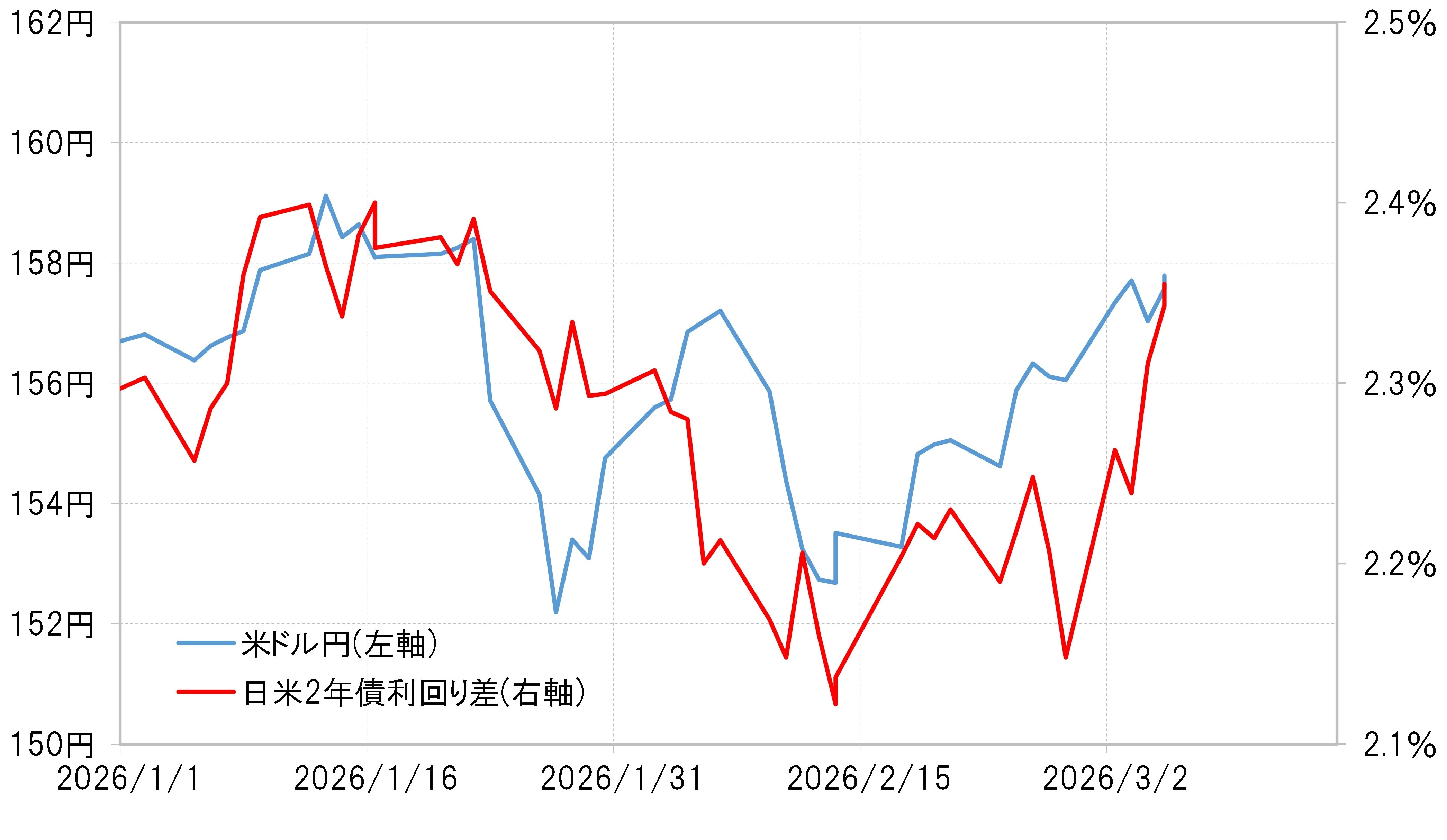 この米ドル/円の上昇は、基本的には日米金利差(米ドル優位・円劣位)拡大にも沿ったものでした。日米の金融政策を反映する2年債利回り差は、1月下旬以来の2.3%以上に拡大し、こういったなかで米ドル/円も、1月23日の日米の通貨当局による円安けん制の「レートチェック」が行われる前に記録した158円台まで上昇するところとなったわけです(図表2参照)。