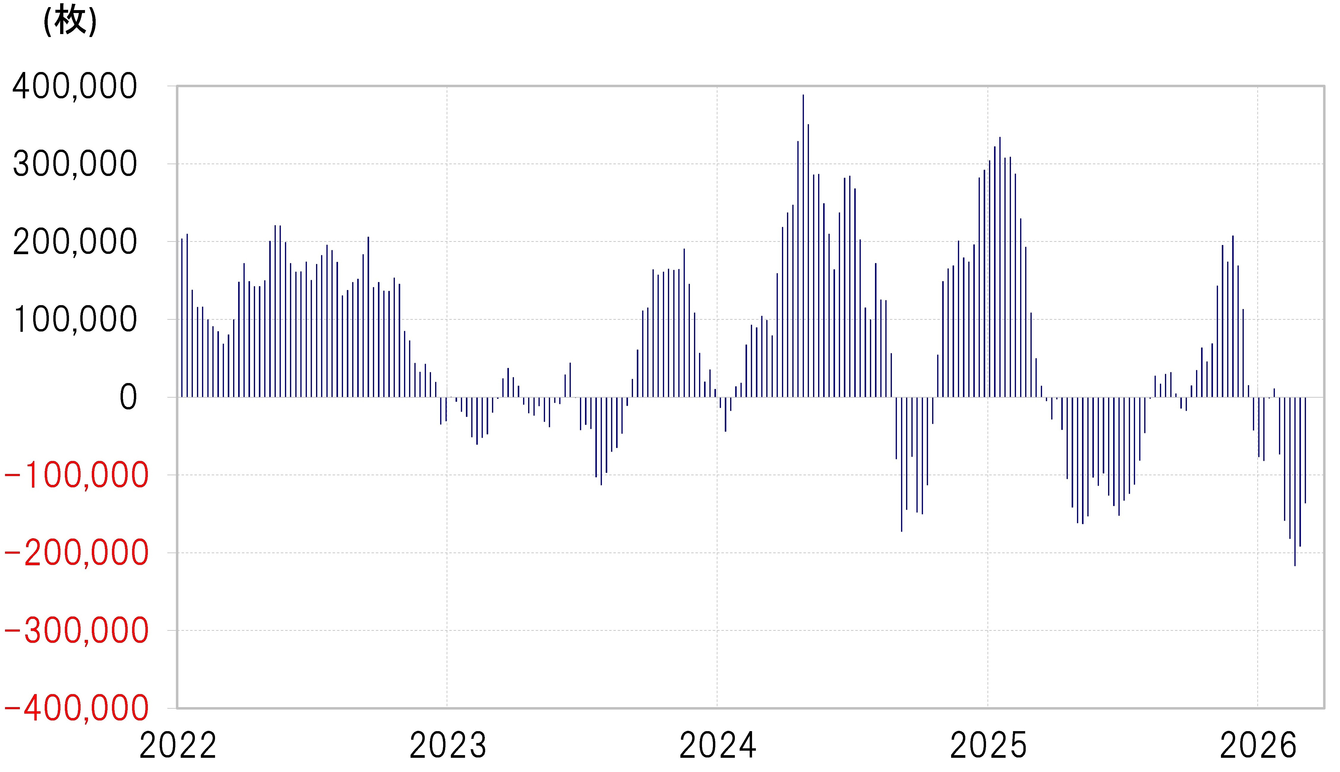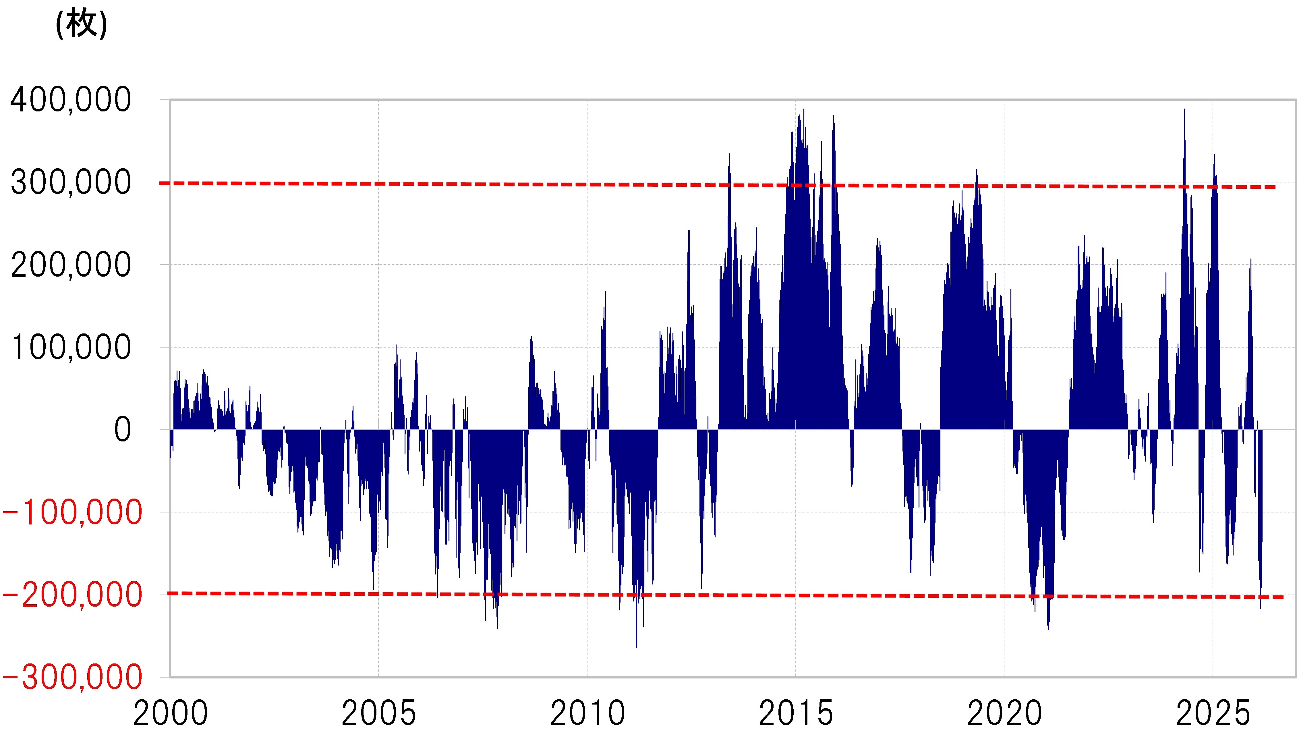 ただ、このイラン攻撃が始まる前、2月末の段階で投機筋の米ドル売り越しは20万枚程度に達するなど、過去の実績を参考にすると「売られすぎ」の状況となっていました(図表5参照)。