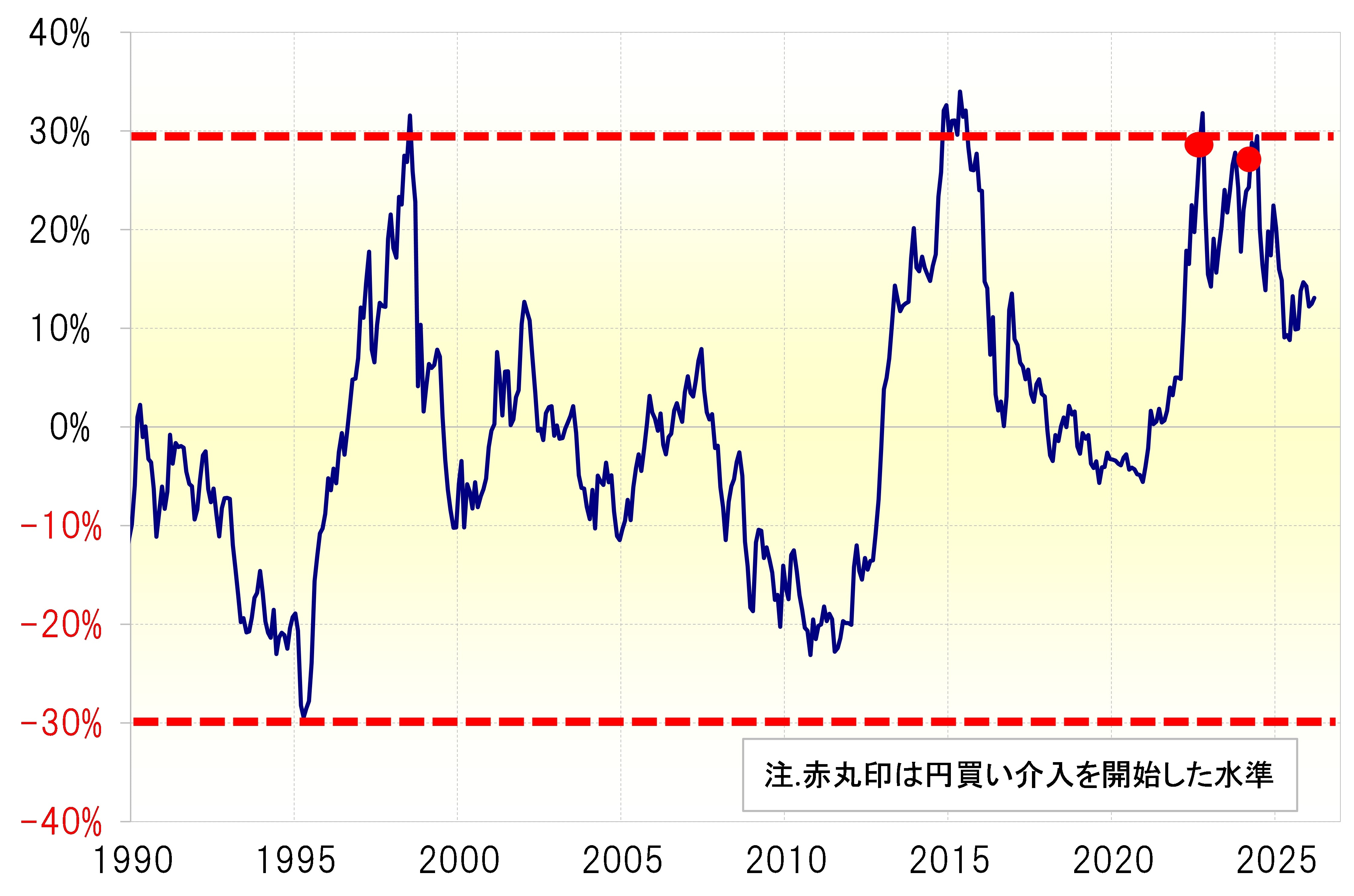 米ドル/円の5年MAかい離率を参考にすると、2024年の160円はかなり米ドル高・円安の「行き過ぎ」懸念が強かったことから、その意味では為替介入によりそれを阻止しやすかったのに対し、足下での「行き過ぎ」懸念はそれほど強いものではないため介入で阻止するのは困難かもしれません。ただ1月23日は、衆院選挙中の「止まらない円安」が高市内閣にとってのマイナス要因となることが懸念されたことから、日米協調という「サプライズ」で円安の反転に成功させたということだったのではないでしょうか。
