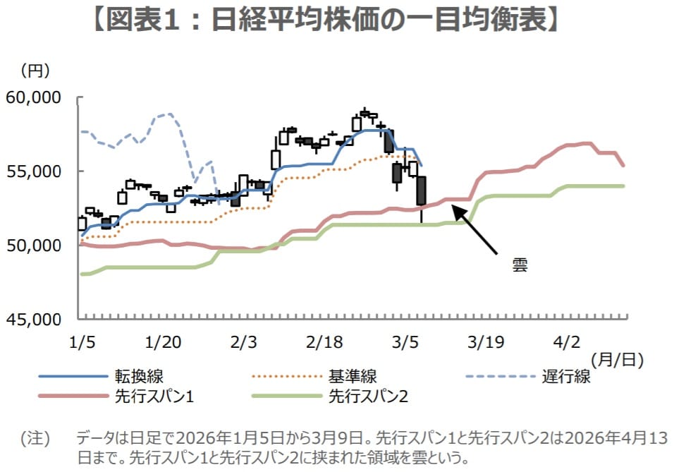 イラン情勢や原油相場の動向をにらみ、日経平均株価は不安定な値動きが続いています。そこで今回のレポートでは、テクニカル分析を用いて、日経平均の現在の立ち位置を確認します。まず、相場のトレンド判断に適した「トレンド系チャート」の代表格である「一目均衡表」からみていきます。日経平均の日足の一目均衡表は図表1の通りで、注目点は、①日足と雲の位置、②転換線と基準線の位置、③遅行線と日足の位置、の3点です。