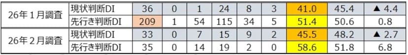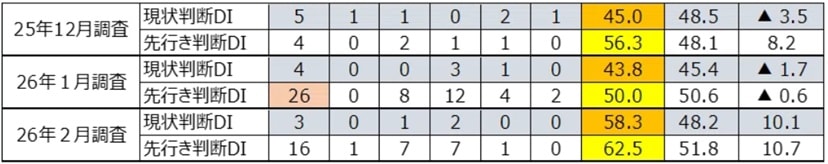 また、2月「政治」関連現状判断DIは58.3、先行き判断DIは62.5とどちらも50超に上昇。24年10月の衆議院選挙で与党が過半数割れとなったときには先行き判断DIが38.5と、低かったことと様変わりです。