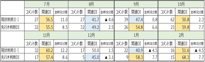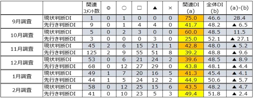 2月の「外国人orインバウンド」関連現状判断DIは49.5と、3ヵ月連続の50割れでしたが、1月の45.7から1.8ポイント改善しました。
